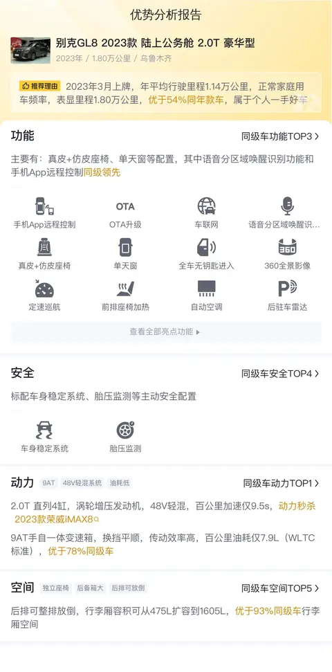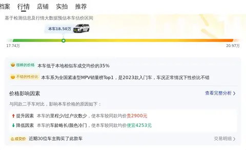 市场行情方面,当前这款别克GL8 2023款 陆上公务舱 2.0T 豪华型的二手车价格在17.74万到20.97万之间。具体的价格因车辆的车龄、里程以及保养情况等不同情况而定,而本车18.5万的报价则在此合理区间内。