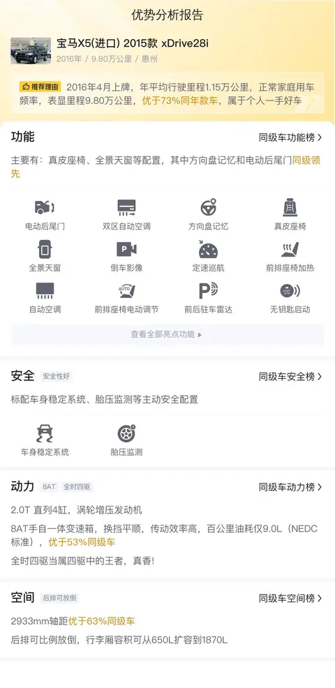 据估算,同级车的用车成本最低是6901元/年,最高是26794元/年,宝马X5(进口) 2015款 xDrive28i的用车成本是19050元/年,用车成本适中,不占优势。