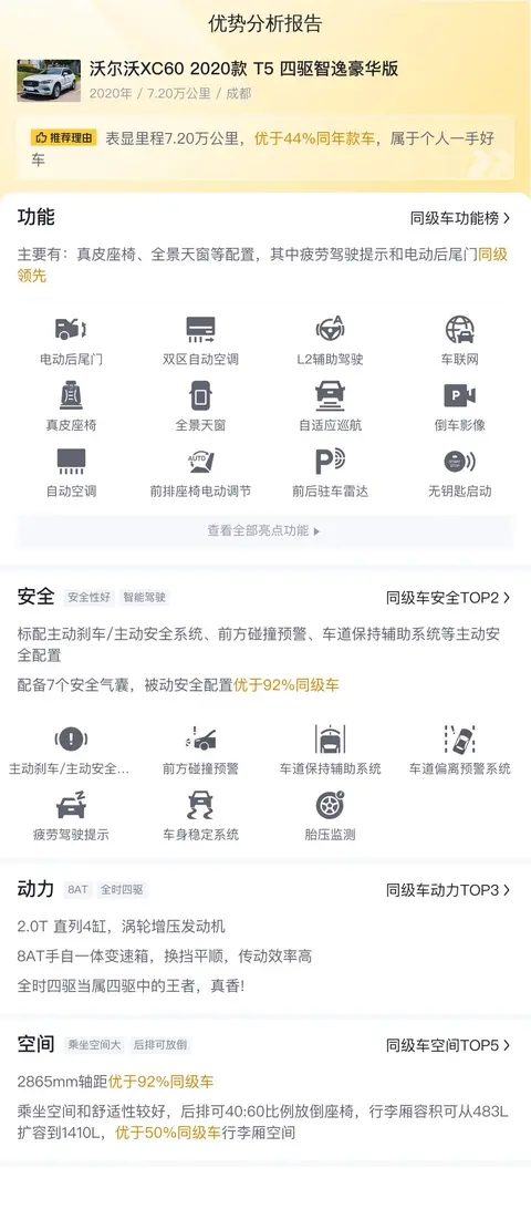 据估算,同级车的最低用车成本是6506元/年,最高是17346元/年,沃尔沃XC60 2020款 T5 四驱智逸豪华版是14632元/年,用车成本较高。