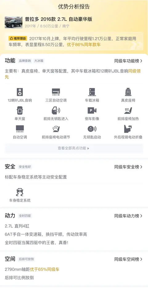 综上所述的新车含税价、用车成本、市场行情、优势分析、同款比价等数据仅供参考。在配置部分,因为二手车非标品,车辆可能会存在配置改装的情况,具体车况信息需要线下结合车辆实际情况进行综合参考。