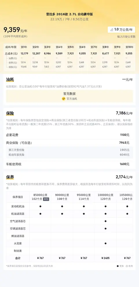 据估算,普拉多 2016款 2.7L 自动豪华版的用车成本是11756元/年, cover 用车过程中的油费、保险费以及保养费,具体费用要看实际情况而定。