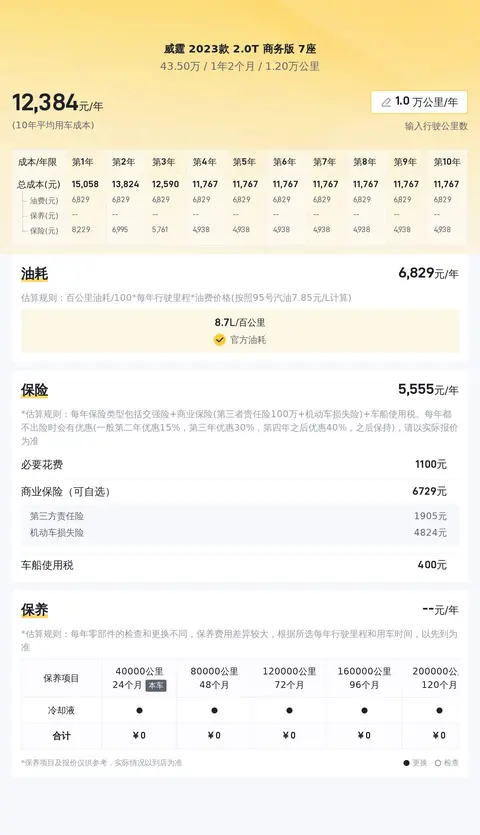 另外,根据估算同级车的最低10年平均用车成本是12345元/年,最高是16516元/年,而这辆威霆是12550元/年,所以用车成本适中。