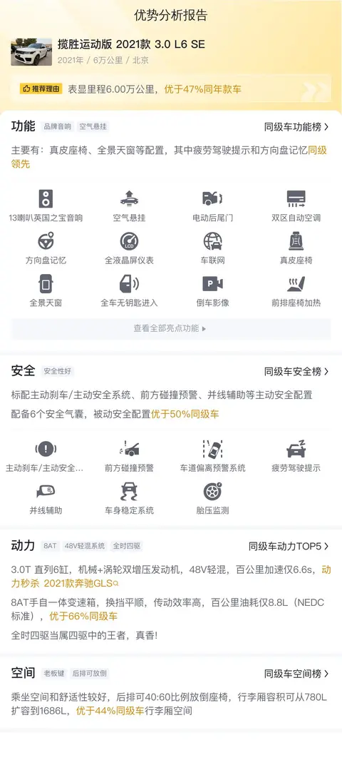 综上所述的新车含税价、用车成本、市场行情、优势分析、同款比价等数据仅供参考。在配置部分,因为二手车非标品,车辆可能会存在配置改装的情况,具体车况信息需要线下结合车辆实际情况进行综合参考。