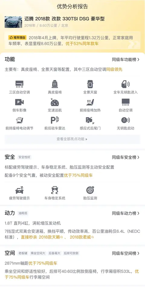 综上所述的用车成本、市场行情、优势分析、同款比价等数据仅供参考,车况信息需要线下结合车辆实际情况进行综合参考。这辆迈腾 2018款 改款 330TSI DSG 豪华型的最大优势就是空间大,适合家庭使用,而且大众品牌的品质过硬,这一款配置也比较高,不过也有明显的缺点,比如里程值过高,养护成本提升,德系车的油耗不低,也会增加用车成本,尤其是这个里程值之下,养护成本会再次提升,需要综合考虑。如果可以接受这些不足,那么花11.3万买一辆家用好车也是不错的选择。