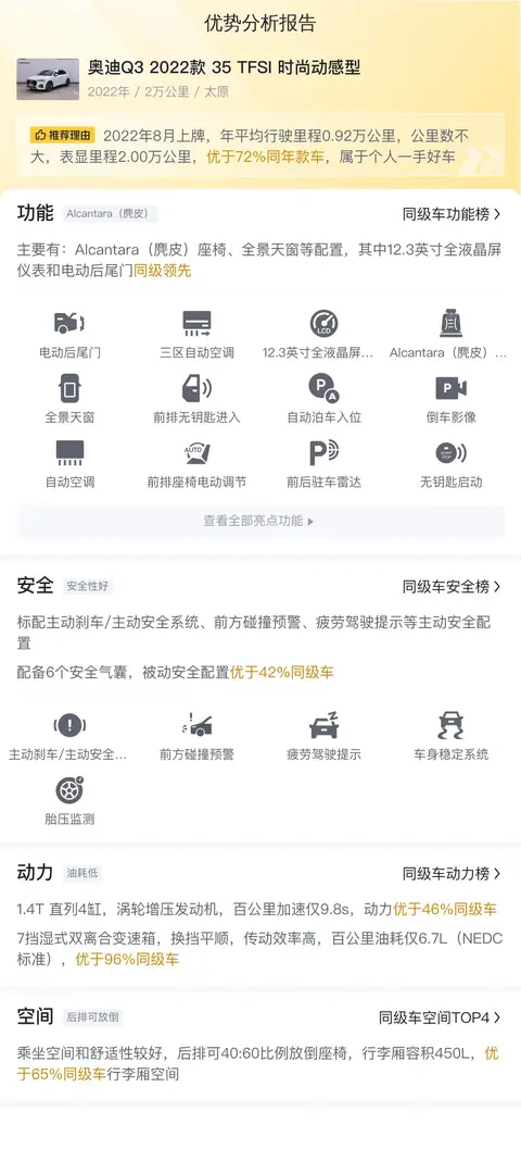 这辆奥迪Q3 2022款 35 TFSI 时尚动感型,上牌日期2022年8月,表显里程2万公里,0过户。新车指导价29.28万,目前二手车报价15.80万,车源地和上牌地都是在太原。车身颜色为白色,国VI排放标准。