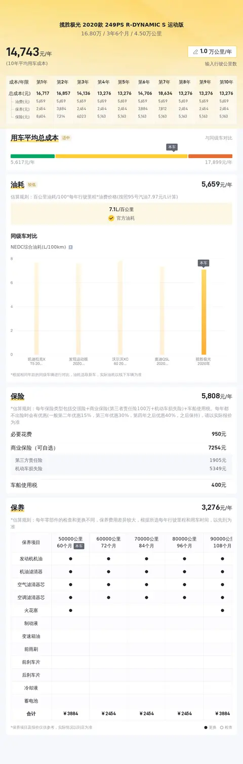 这辆揽胜极光 2020款 249PS R-DYNAMIC S 运动版的10年平均用车成本是15139元/年,同级车的最低10年平均用车成本是14170元/年,最高是16938元/年,所以它的用车成本适中。