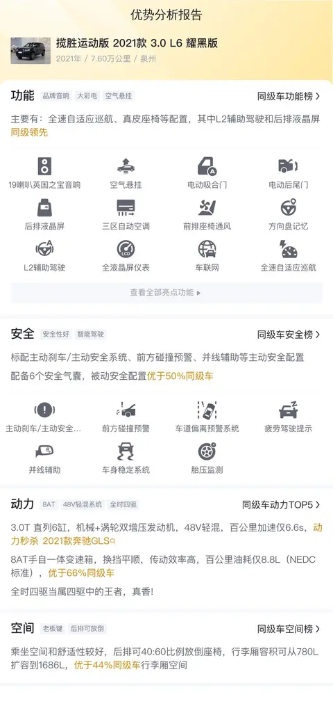 优点:本车作为一款豪华SUV,拥有强大的动力性能和舒适的驾乘体验,深受消费者的青睐。外观时尚大气,内部配置豪华,包括高级座椅、智能互联系统等,都能提供高品质的驾乘感受。此外,该车的空间表现也非常出色,无论是乘坐空间还是储物空间都非常充足,可以满足家庭出行的各种需求。而且,该车还配备了多种智能驾驶辅助系统,如倒车影像、车道偏离预警等,都能提高驾驶的安全性和便捷性。