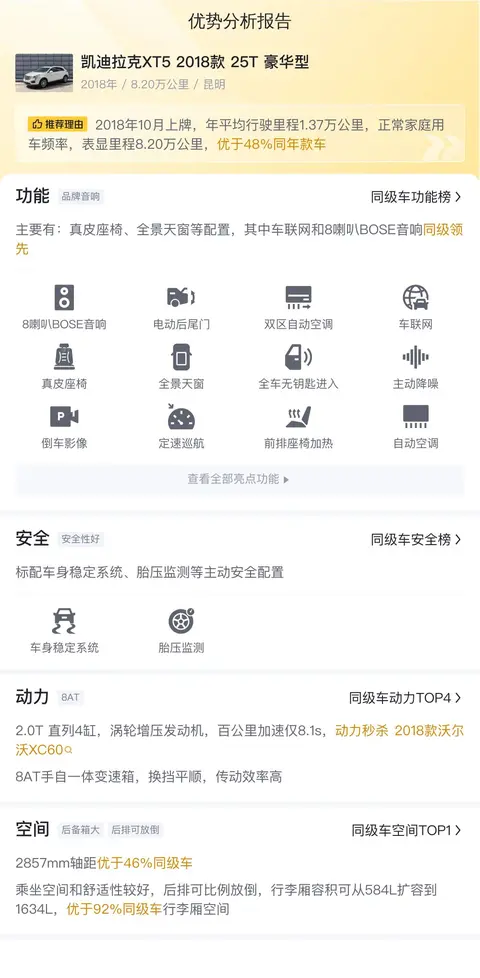定位是中型SUV,车身外观颜色为白色,内饰是深色配色。车源地和上牌地都是昆明。同时累计行驶里程是8.20万公里,该车符合国V排放标准。2018年10月首次上牌,在此期间过户2次。