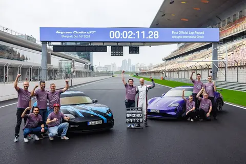10月16日,保时捷 Taycan(图片|配置|询价) Turbo GT 由研发车手拉尔斯·克恩(Lars Kern)驾驶在半湿润的赛道上,以2分11秒28的成绩创造了上海国际赛车场(SIC)首个官方认证的最快量产车圈速纪录。