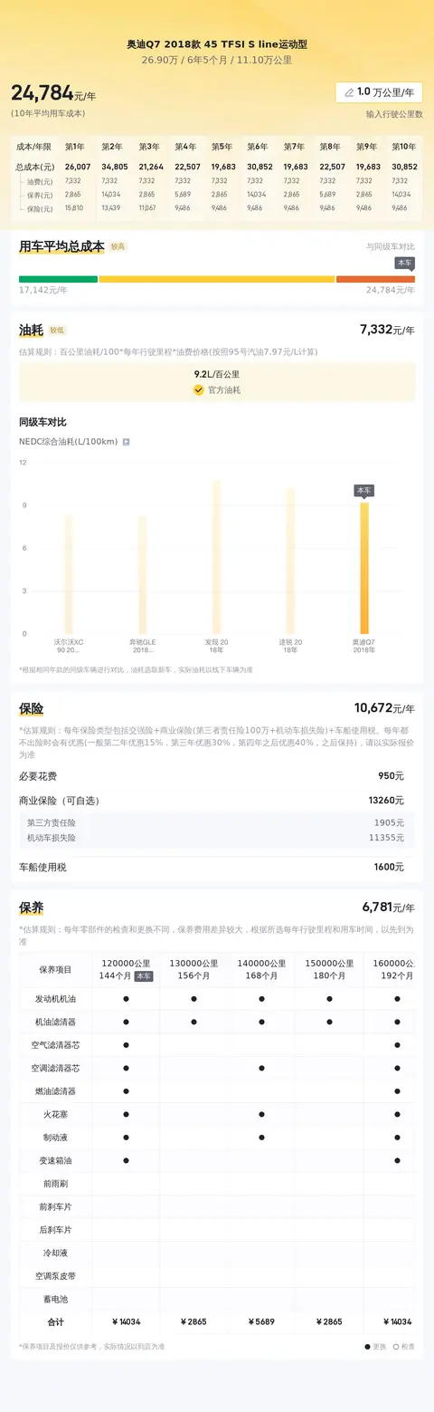 当前这款奥迪Q7的二手车市场行情价位在27万至35万之间,具体价格受车辆状况等因素影响。关于用车成本方面,根据估算,该车的年均综合用车成本大约为2.5万元左右,实际费用根据车主的使用习惯和所在地消费水平而有所不同。