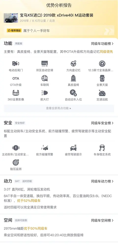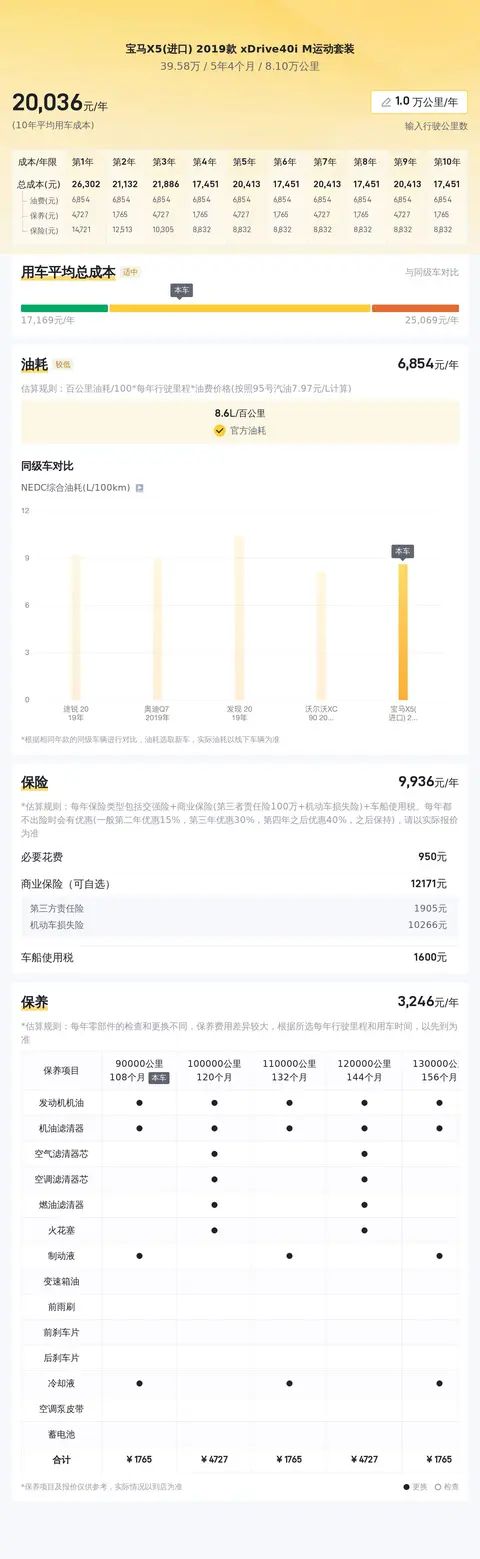 据估算,同级车的最低用车成本是13986元/年,最高是22726元/年,宝马X5(进口) 2019款 xDrive40i M运动套装是20370元/年,用车成本适中,不占优势。