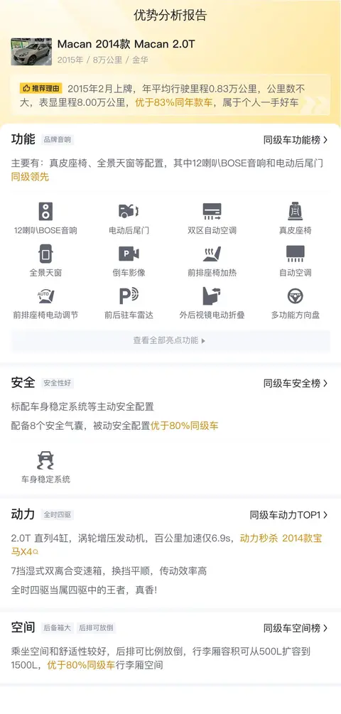 优势在于Macan一脉相承的跑车基因让其驾控乐趣不俗,底盘质感和行驶品质让人印象深刻,同时收获不少回头率。其次本车的里程不高,留给下一任车主的发展空间尚且充裕。