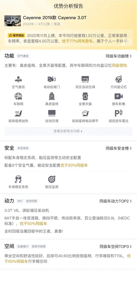 优势:作为保时捷的车型,Cayenne的知名度尚可,保值率比较高。这辆Cayenne 2019款 Cayenne 3.0T的行驶里程不多,保存良好,动力强劲,操控好,而且具有豪华感。