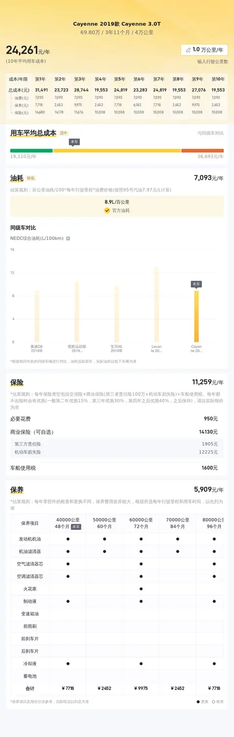 Cayenne 2019款 Cayenne 3.0T的10年平均用车成本是23962元/年,同级车最低是16070元/年,最高是46793元/年,所以它的用车成本偏高。