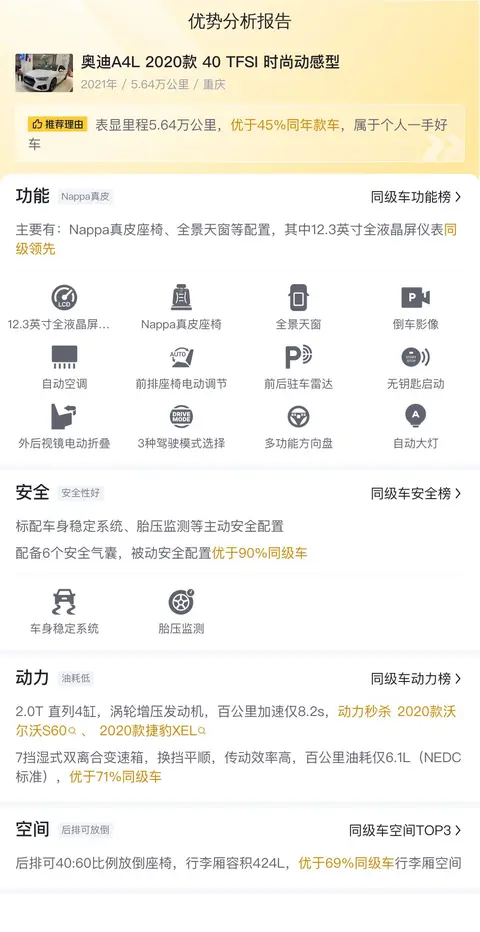除了车况,购车还应考虑用车成本、市场行情和用车成本等因素。奥迪A4L 2020款 40 TFSI 时尚动感型的市场行情价在15.65万至18.61万之间,而这款车的售价为17.28万,处于合理区间之内。根据大数据分析,这辆车的性价比得到了81%的认同,显示出它在市场上的竞争力。此外,这款车在全国中型车销量榜上排名第9,进一步证实了其受欢迎程度。