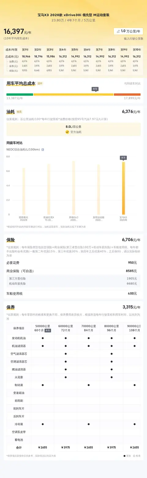 据估算,宝马X3 2020款 xDrive30i 领先型 M运动套装的用车成本较低,因为它的用车成本是15718元/年,同级车最低是15264元/年,最高是18226元/年。