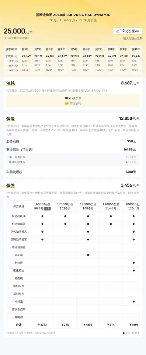 这车啊看着豪华,养着啊可得有点经济实力,官方给的综合油耗啊是10.9L/100km,不过啊根据车主反馈,在城市里啊真实油耗啊可能得15L/100km左右,一年的保养费啊大概5000块,保险费啊一年啊大约11000块,这费用啊可真不少,当然啦养车成本跟每个人的用车方式啊还有习惯啊都有关系,这里啊咱们就按照每年行驶2万公里来算,油费+保险+保养的平均成本啊大约是33718元/年,折合到每公里啊大约是1.69元/km,这成本啊确实不低,选这款车啊还是得好好考虑考虑。
