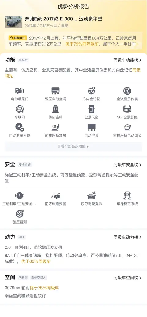 综上所述,这款二手奔驰E级是一款集豪华、科技和性能于一身的中大型轿车。它在动力、内饰、空间等方面表现出色,同时具有较高的保值率和品牌影响力。然而,车主在购买前也需要考虑到保养维修成本较高这一因素。如果车主有足够的经济实力,并且对豪华轿车有着较高的追求,那么这款车将是一个不错的选择。