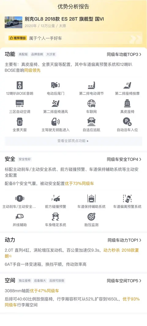 针对这款二手别克GL8的具体表现,我们进行了深入的分析与评估。该车在多个方面展现了出色的竞争力,特别是在舒适性和动力方面获得了高度评价。然而,在细节处理和变速箱表现上,则显露出了一定的不足。尽管如此,这款车依然以其宽敞的空间、豪华的配置以及强劲的动力赢得了消费者的广泛赞誉。因此,可以说这款车在整体性能上表现优秀,但在个别细节上仍有提升空间。