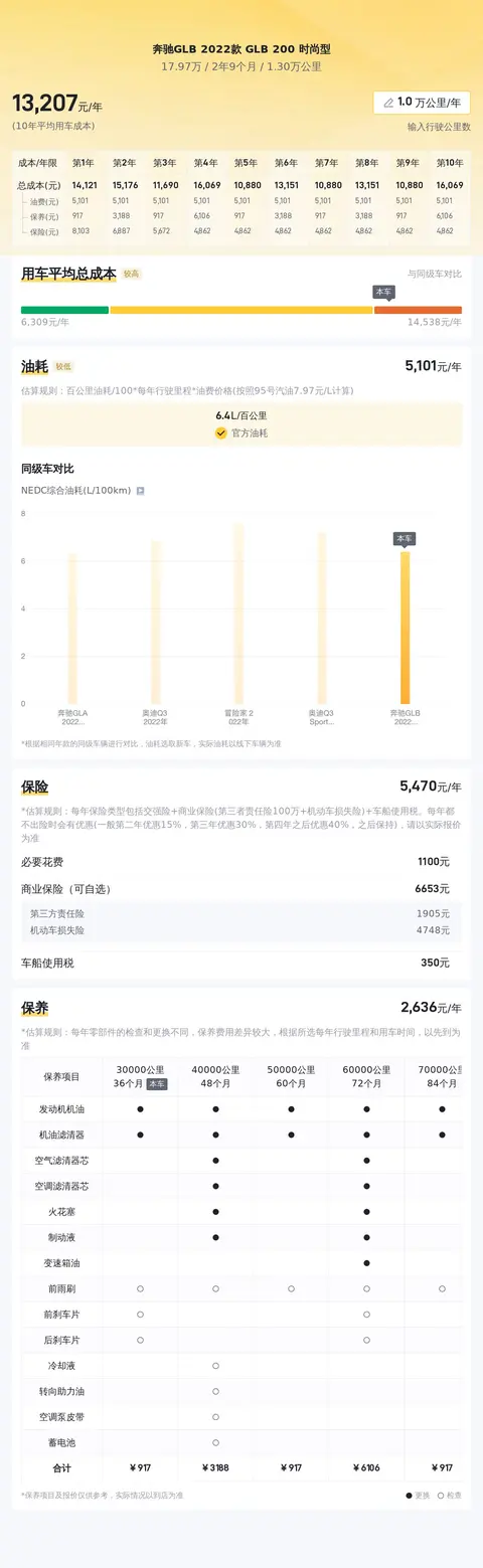 年,保养费用大约为3325元/年,这些费用在同级别车型中也都属于较低的水平。总的来说,选择奔驰GLB 2022款 GLB 200 时尚型,你不仅可以享受到豪华舒适的驾乘体验,还可以节省一大笔用车成本,可以说是一款非常值得推荐的车型。