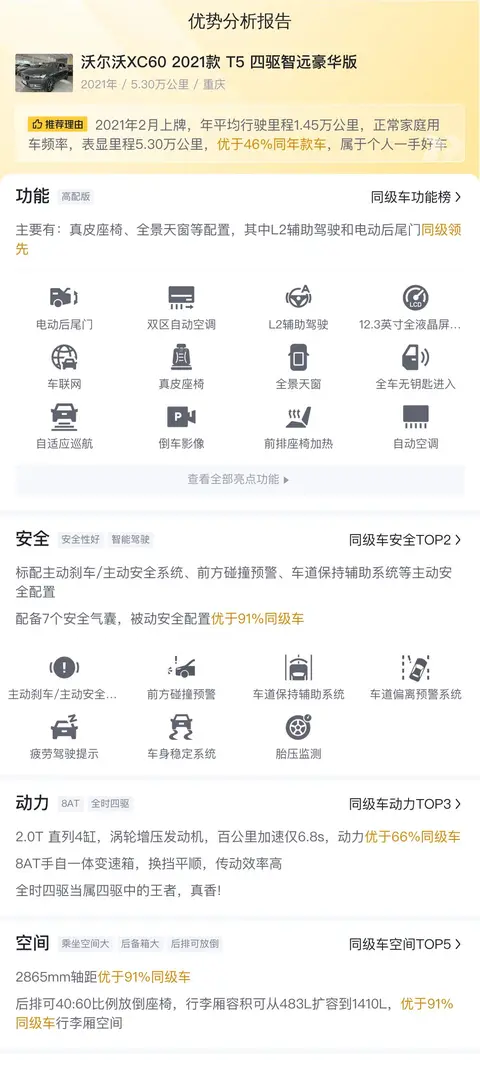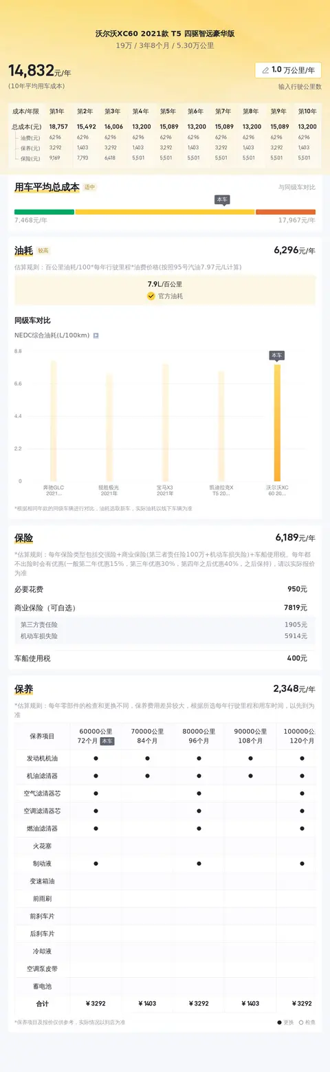 关于用车成本,根据我们估算,这辆沃尔沃XC60的年均综合用车成本约1.5万元左右。这项花销是跟车主的实际用车场景和使用强度有直接变化的。好了,接下来让我们看看这辆车的配置情况。