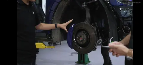 车辆举起来之后,比较亮眼的部分就是蓝色的Brembo四活塞运动卡钳。