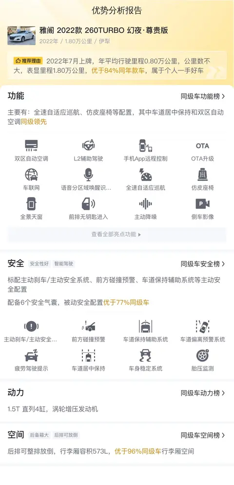 综上所述的新车含税价、用车成本、市场行情、优势分析、同款比价等数据仅供参考。在配置部分,因为二手车非标品,车辆可能会存在配置改装的情况,具体车况信息需要线下结合车辆实际情况进行综合参考。