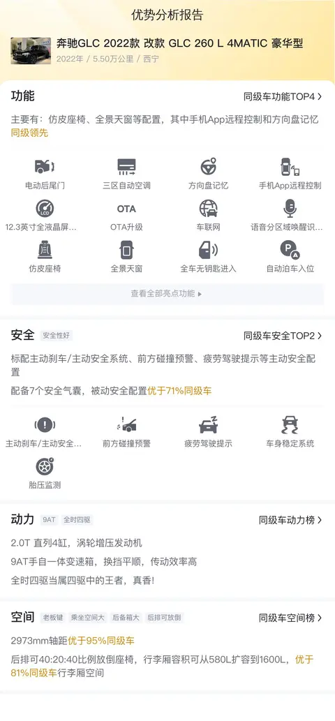 这辆奔驰GLC 2022款 改款 GLC 260 L 4MATIC 豪华型主要优势在于豪华感强,舒适性好,四驱性能对于喜欢越野的车友来说非常赞。并且这辆车是2022年的车,到现在也就两年多的时间,车龄很短,公里数5.5万公里也不算多,整体车况保持的很好,与新车基本无异。