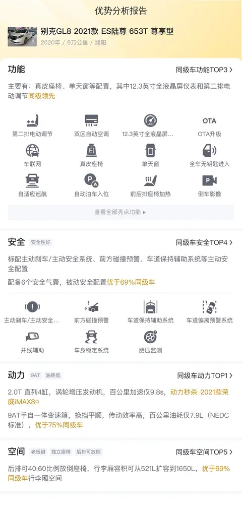 据估算,同级车的最低用车成本是13986元/年,最高是16823元/年,别克GL8 2021款 ES陆尊 653T 尊享型是15527元/年,所以用车成本适中。