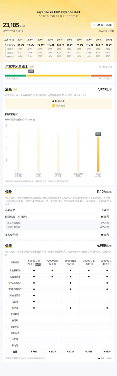 当前市场上,这款Cayenne的二手价格区间大致在56万至68万之间。我们所提供的53.8万的报价,相较市场而言更具竞争力,无疑为追求性价比的消费者提供了优质选择。就使用成本而言,该车的年均综合用车成本约为2.3万元,对于一款豪华SUV而言,这一数字属合理范畴,且与同级别车型相比,其保值率高于平均水平,进一步凸显了其长期持有的价值。