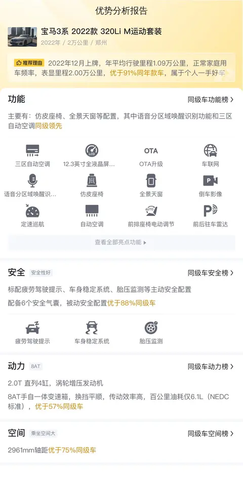 当然,每个品牌和车型都有其自身的特性和魅力。选择哪一款车型还要根据个人的需求、偏好和预算等因素来综合考虑。但从产品品质、品牌知名度、售后服务等方面来看,这辆宝马3系2022款320Li M运动套装无疑是一款非常优秀和值得推荐的二手车。