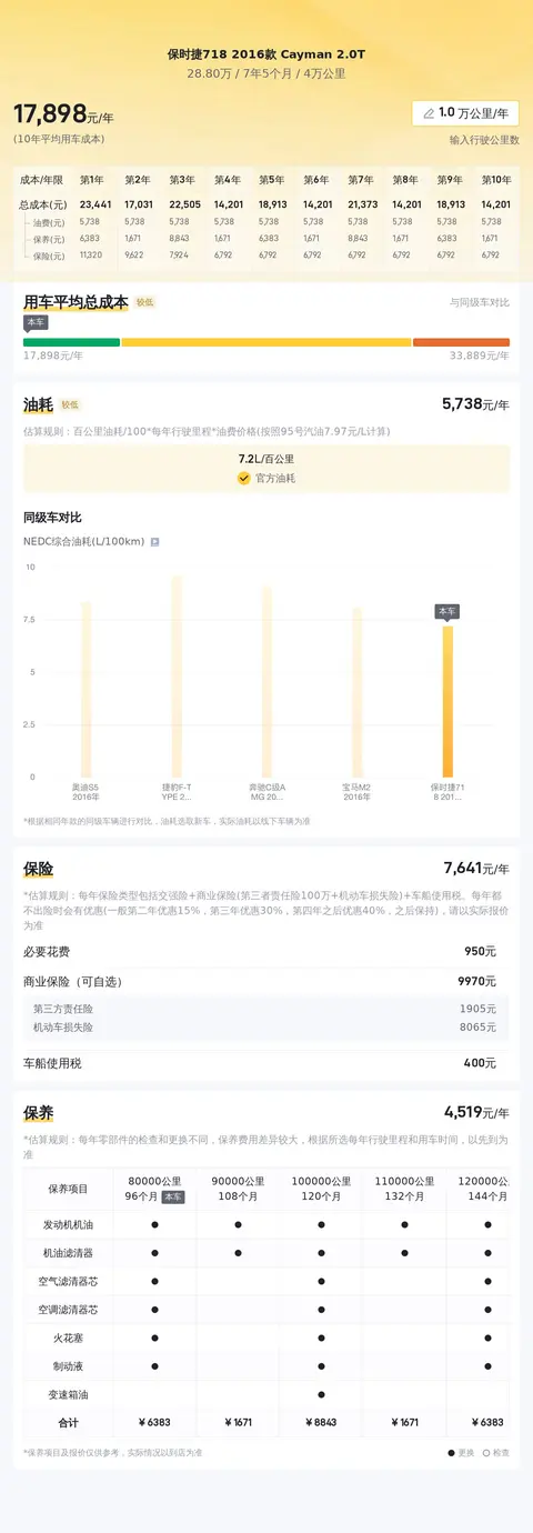 经过懂车帝综合分析,这辆保时捷718 2016款 Cayman 2.0T的10年平均用车成本大约为18446元/年,相较于同级别其他车型,用车成本适中,性价比较高。