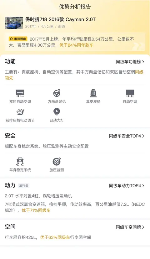综上所述,这辆二手保时捷718 2016款 Cayman 2.0T是一辆在动力性能、操控性、品牌价值方面具有明显优势的跑车。尽管存在车内空间局促、内饰塑料件多、座椅舒适性一般、车载电子设备较少以及维修保养成本高等不足之处,但这并不影响其作为一款出色的跑车的本质。如果您是一位热爱驾驶、追求速度与激情的车迷,那么这辆二手保时捷718 2016款 Cayman 2.0T或许会成为您的理想座驾。需要注意的是,该车辆没有检测报告,建议在购买前进行详细的检查和试驾,确保车辆的实际状况符合您的期望。