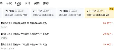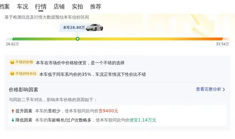 当前市场上,这款车型的二手车价格区间大致在27.62万至34.48万之间。该车售价28.80万元,处于市场均价的较低水平,价格较便宜,是一个不错的选择。