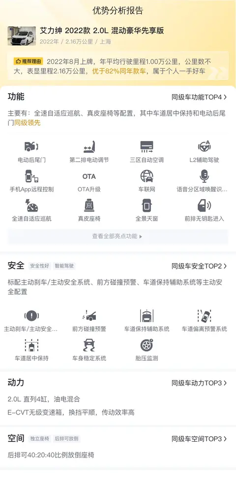 综上所述的新车含税价、用车成本、市场行情、优势分析、同款比价等数据仅供参考。在配置部分,因为二手车非标品,车辆可能会存在配置改装的情况,具体车况信息需要线下结合车辆实际情况进行综合参考。