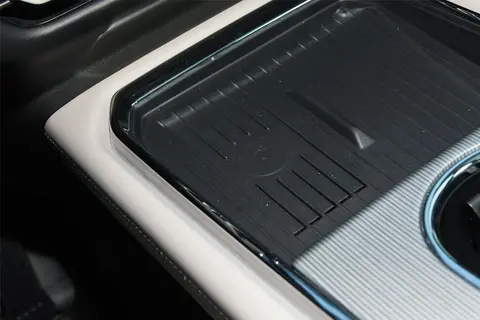 内饰配色清爽简约,黑色的皮质大面积的覆盖台面,还加入了白色的缝线以及镀铬饰条装饰,看上去挺有质感的。车内搭载14.6英寸的横向中控屏幕,内置高通骁龙8155车机芯片,提供了毫秒级触控响应和丝滑流畅的画面显示。还带有50英寸高清AR-HUD平视显示系统,支持3D全息人脸无感识别登录、7种手势控制、11种座舱模式。方向盘采用双辐式设计,为皮质面料,握感舒适。采用了怀挡设计,为前排岛台提供更多的储物空间,岛台为掏空处理,上层带有50W的手机无线充电面板,下层可以放一些随身物品。