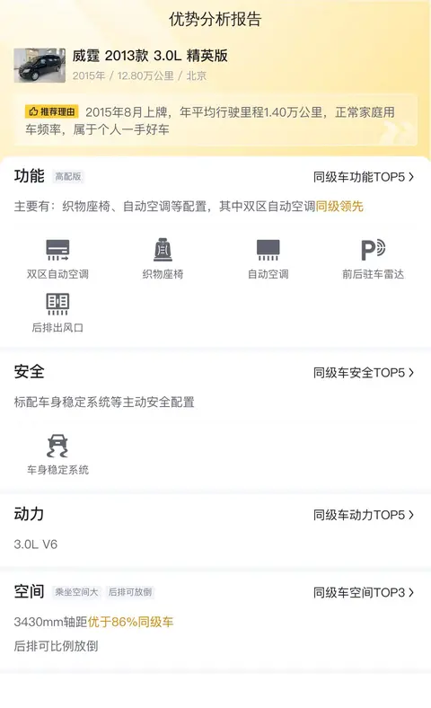 据估算,同级车的最低用车成本是17968元/年,最高是23380元/年,威霆 2013款 3.0L 精英版是20271元/年,用车成本适中,不占优势。