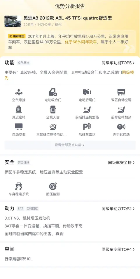 综上所述的新车含税价、用车成本、市场行情、优势分析、同款比价等数据仅供参考。在配置部分,因为二手车非标品,车辆可能会存在配置改装的情况,具体车况信息需要线下结合车辆实际情况进行综合参考。