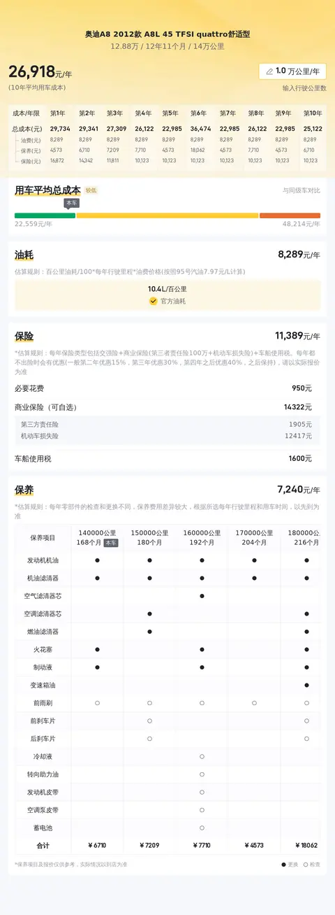 关于用车成本部分,年均综合用车成本大约为2.7万元左右。需要注意的是,实际费用支出可能会因使用频率、环境条件及维护习惯等因素有所变动。