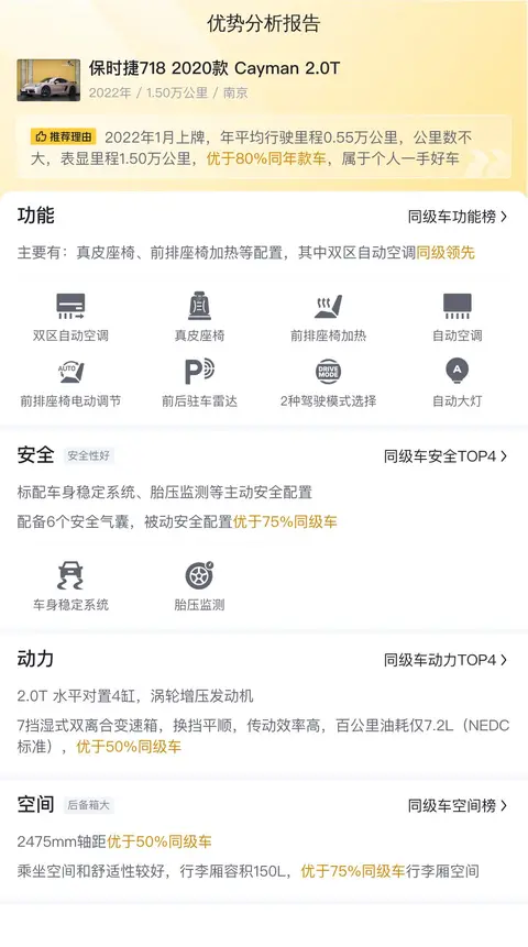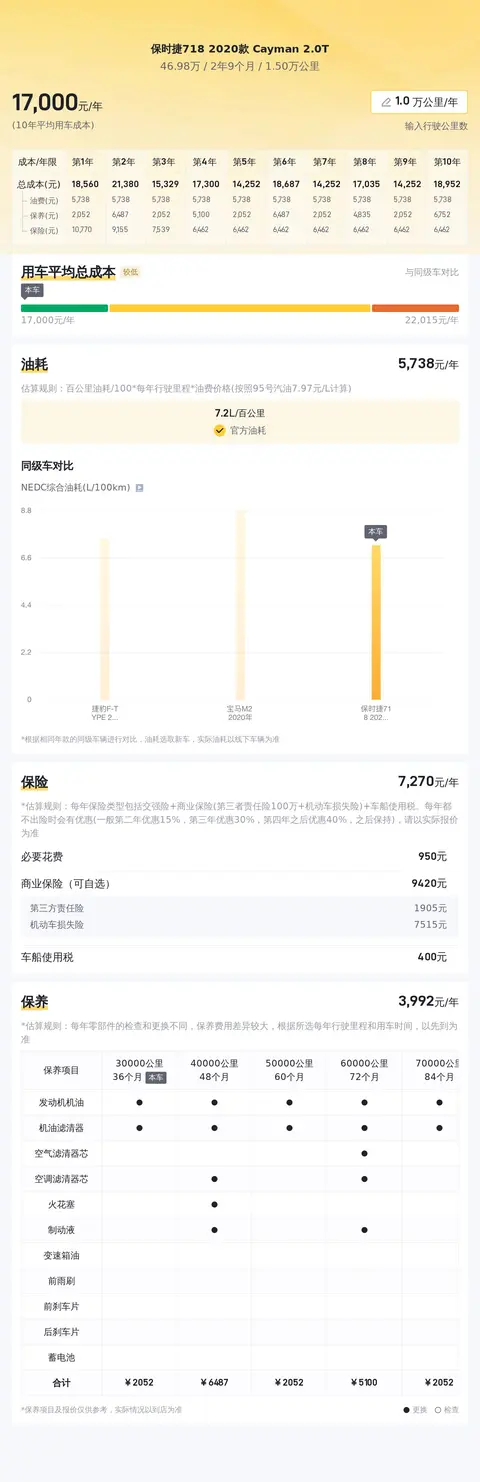 据估算,同级车的最低用车成本是13598元/年,最高是20131元/年,保时捷718 2020款 Cayman 2.0T是16635元/年,用车成本适中,但不低。