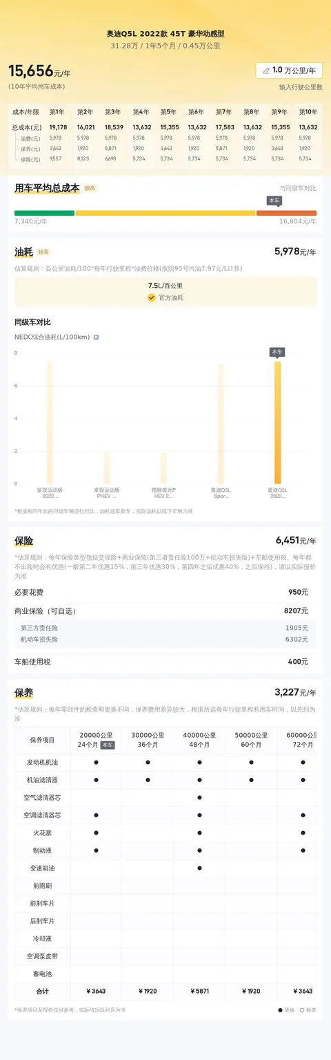 奥迪Q5L 2022款 45T 豪华动感型的二手车市场行情目前较为稳定,且存在一定的升值空间。根据当前市场行情,该车型的二手车价格大致在30.39万至33.06万之间。而此次介绍的这辆奥迪Q5L 2022款 45T 豪华动感型二手车,售价为31.28万元。关于用车成本方面,该车官方公布的百公里油耗为7.5L,按此计算,每年油费约为6463元;保险费用预估约为5638元,保养费用约为3208元,年均综合用车成本约15309元。需要注意的是,这些费用会根据实际使用情况和个人驾驶习惯有所变动。