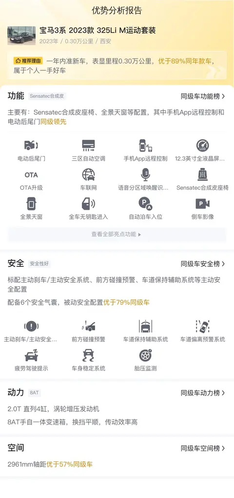 优势方面,这辆宝马3系 2023款 325Li M运动套装的行李厢空间大,可以装更多东西,同时百公里油耗也低,动力也不错,配置也挺丰富,可以说在各方面它都有一定优势。