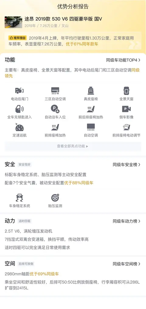 综上所述的新车含税价、用车成本、市场行情、优势分析、同款比价等数据仅供参考。在配置部分,因为二手车非标品,车辆可能会存在配置改装的情况,具体车况信息需要线下结合车辆实际情况进行综合参考。