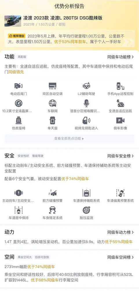 综上所述的新车含税价、用车成本、市场行情、优势分析、同款比价等数据仅供参考。在配置部分,因为二手车非标品,车辆可能会存在配置改装的情况,具体车况信息需要线下结合车辆实际情况进行综合参考。