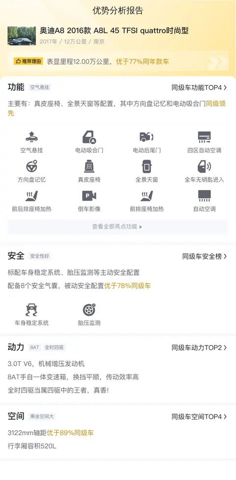 市场行情方面,根据大数据分析,这款奥迪A8L的二手车价格区间大致在21.71万至23.48万之间。具体的价格因车辆的车龄、里程以及保养情况等不同情况而定,而本车22.88万的报价处于合理区间之内。