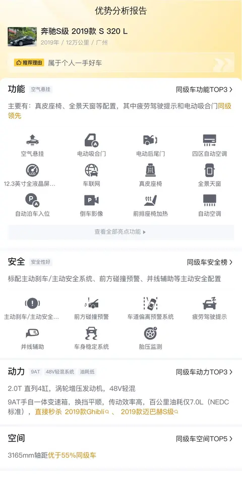 该车的具体版本为2019款改款S 320 L,上牌地车源地均为广东广州,上牌时间为2019年3月,表显里程12万公里,排放标准为国VI,新车指导价84.28万,本文撰写时的二手车报价41.8万元,车身颜色为黑色,0过户。