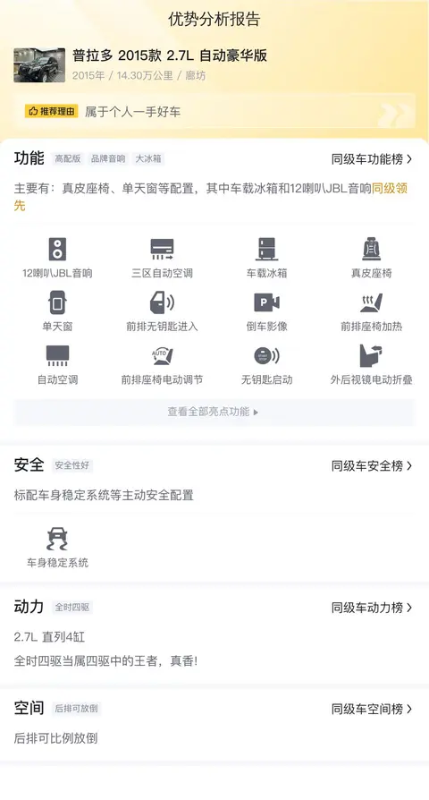 报价相对较低,普拉多 2015款 2.7L 自动豪华版的市场行情价是17.81万-19.33万,它的报价则是17.98万,价格上有很大优势,同时保值率也高。