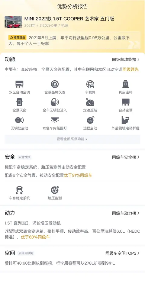 综上所述的新车含税价、用车成本、市场行情、优势分析、同款比价等数据仅供参考。在配置部分,因为二手车非标品,车辆可能会存在配置改装的情况,具体车况信息需要线下结合车辆实际情况进行综合参考。