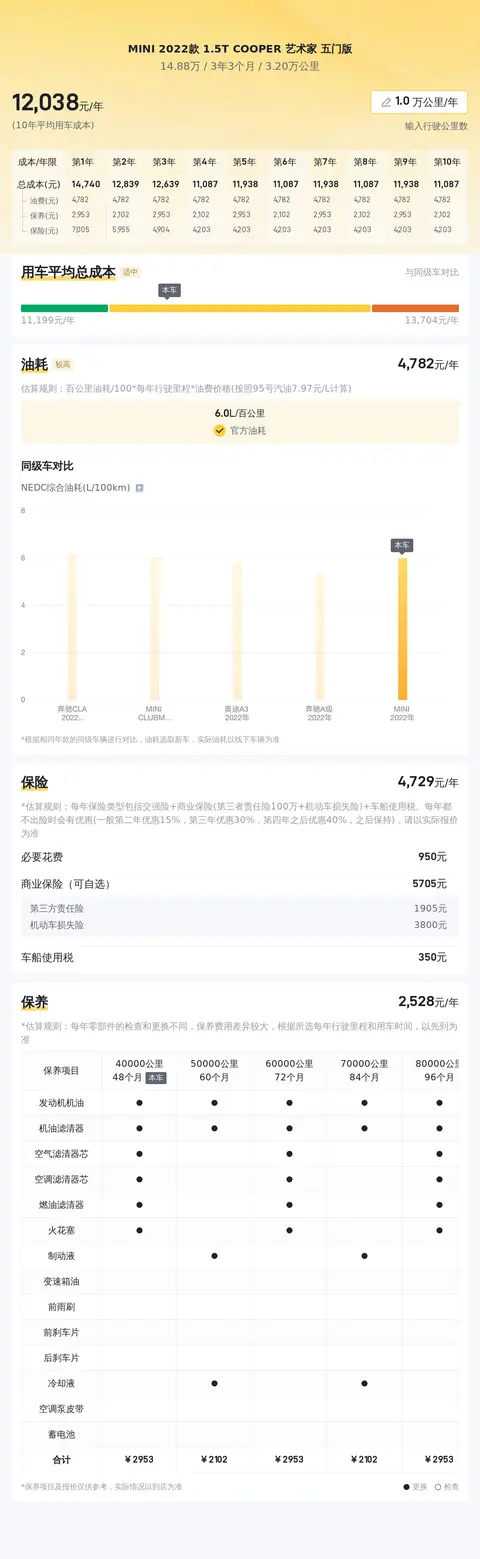 但买车容易养车难,咱们得精打细算。按照每年 2 万公里的行驶里程来计算,10年平均用车成本大约在13159元/年,这其中包括了油费、保养费、保险费以及可能出现的其他费用。虽然看着数字好像不少,但在享受MINI带来的艺术生活和驾驶乐趣时,这点花费简直不值一提!