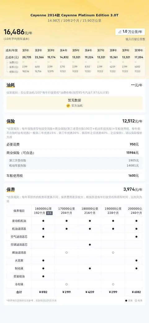 这辆Cayenne是2014年9月在宁波上的牌照,表显里程15.9万公里,有两笔过户记录。由于没有看到这辆车的检测报告,所以暂时无法为您详尽解读车况,不过我们可以先了解一下这辆车其他的情况。